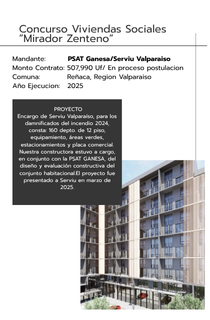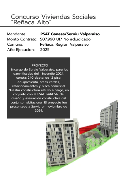 Encargo de Serviu Valparaíso, para los damnificados del incendio 2024, consta: 160 depto. de 12 piso, equipamiento, áreas verdes, estacionamientos y placa comercial.