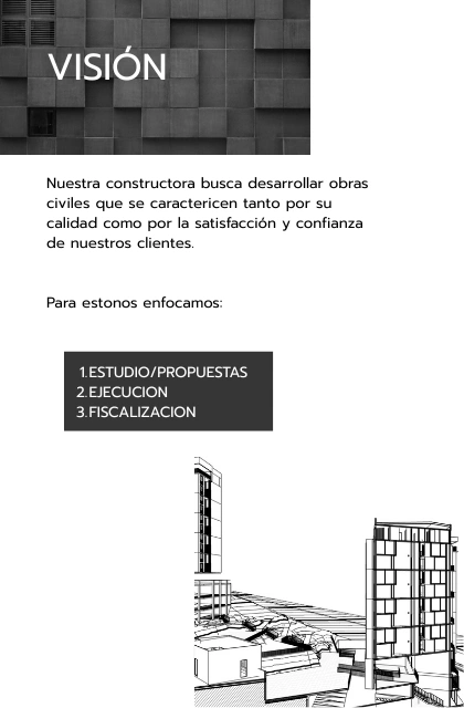 Nuestra constructora busca desarrollar obras civiles que se caractericen tanto por su calidad como por la satisfacción y confianza de nuestros clientes.